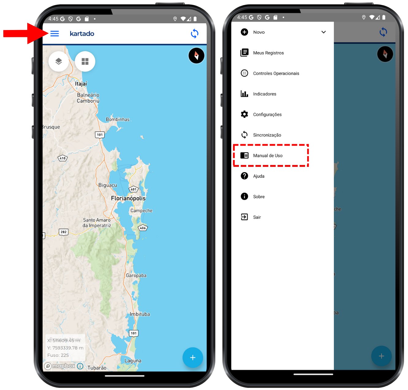 Na tela principal, toque no botão para abrir o menu lateral e, em seguida toque na opção 'Manual de Uso'.